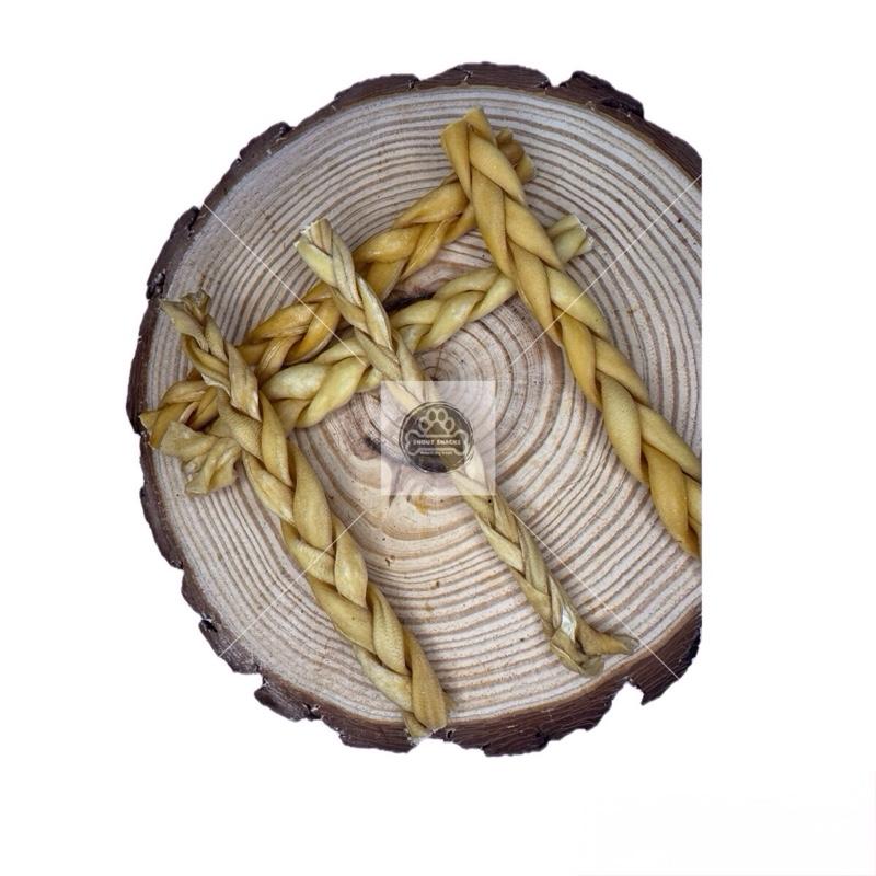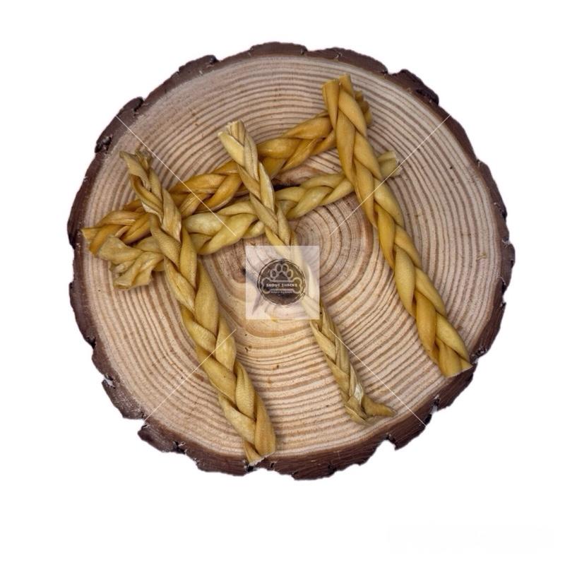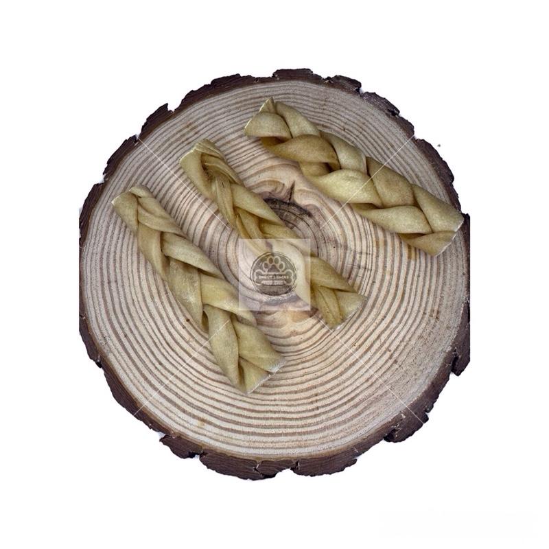 The braiding process not only adds to the treat's visual appeal but also provides an engaging chewing experience for dogs.