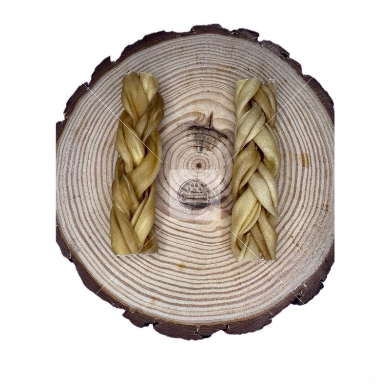 Our Braided Skins are made by braiding together strips of skin to create a durable and long-lasting chew.